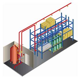 Söndürücü köpük, bir köpük tankı içerisinde ve saf halde depolanmaktadır. Sprinkler sistemlerindeki gibi, ıslak, deluge vepreaction olarak sistem çaılışabilir. Köpük tanktan çıkınca birkarıştırıcı vasıtasıyla su ile, belli bir oranda karıştırılır. Boşaltma aracı olarak uygulamasına göre değişen, köpük monitorleri veya köpük jenatörleri kullanılır.